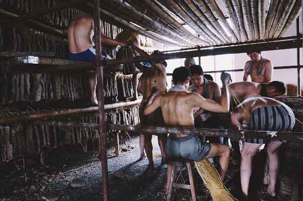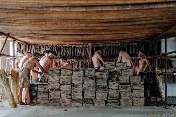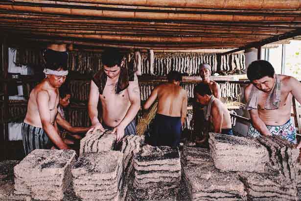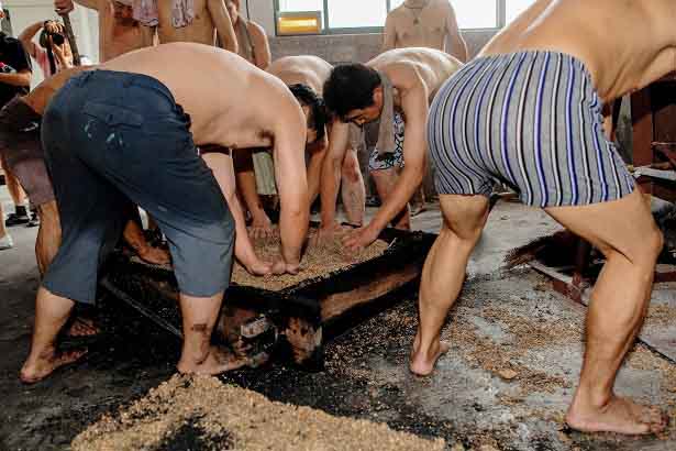 踏曲。曲的原料以纯小麦为佳,若搀入大麦、玉米、黄豆…等杂粮则次之,将小麦粉碎,加水搅和后,送入打曲箱,压成方形曲块,晾干后每块重约3斤,使其发酵,曲菌在曲块内部大量繁殖,此过程约需30天。