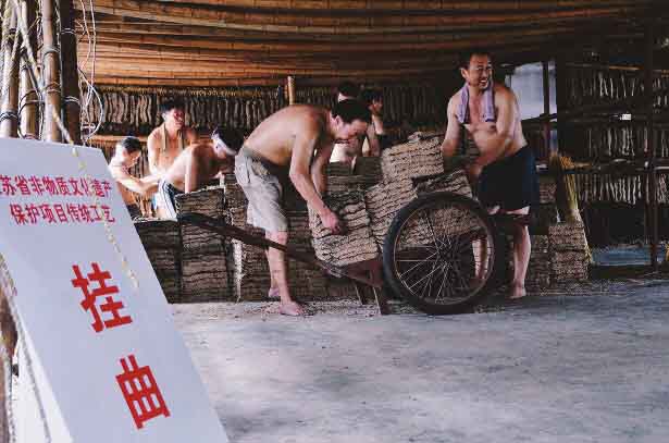 挂曲。麦曲是酿酒中不可缺少的主要辅料,称为酒中之骨。每年大伏天,糖化霉菌最活跃期间,采用优质小麦进行制曲。夏天制曲,气候条件适宜,不用加温,让其自然发酵,多种野生糖化酶菌能附着在麦曲上,收集糖化霉条件良好,菌种丰富、曲香浓厚,安全卫生。